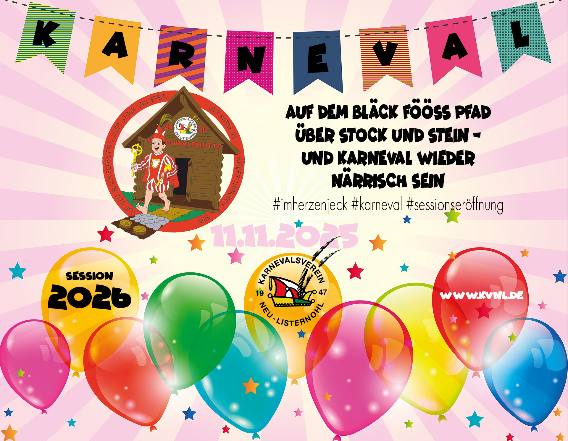 (11.07.2025) Am heutigen Dienstag starten wir endlich wieder in die neue Karnevalssession. In dieser Session 2025/26 feiern wir unter dem Motto "Auf dem Bläck Fööss Pfad über Stock und Stein und Karneval wieder närrisch sein". Hiermit schaffen wir die Verbindung zwischen unserem geliebten Karnevalsfest und dem Barfußpfad im Narrenwald, der durch unseren Verein betrieben wird. Wir sind im Herzen jeck und wünschen Allen einen tollen Start in die neue Session. Ruft mit uns aus, auf die neue Session 2026 ein dreifach donnerndes Neu-Listernohler HELAU!
