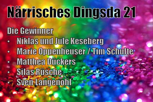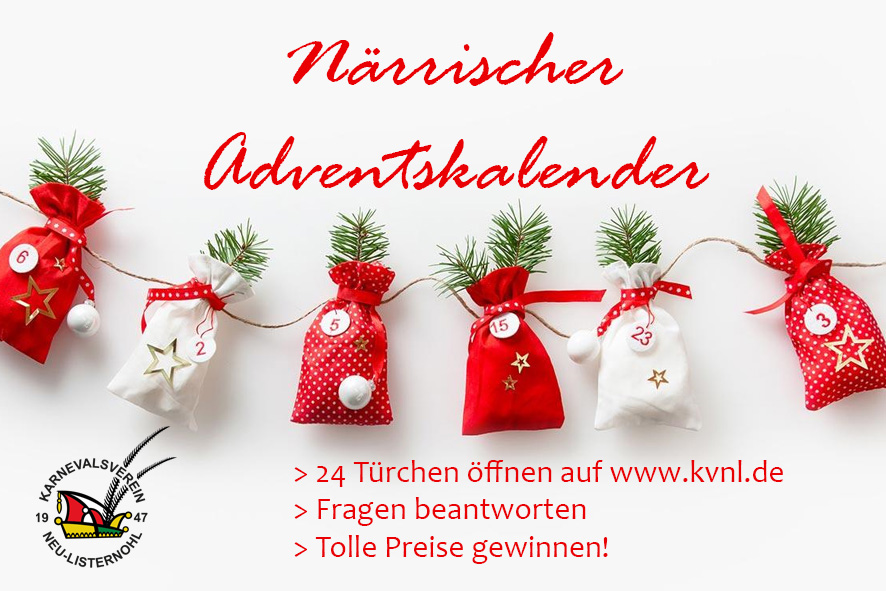 (26.12.2021) Wir gratulieren den diesjährigen Siegerinnen und Siegern des Närrischen Adventskalenders 2021. Insgesamt mussten 24 Fragen beantwortet werden. Alle drei Plätze mussten am Ende per Los entschieden werden. Wir danken allen, die beim diesjährigen Gewinnspiel teilgenommen haben und hoffen es hat ein wenig Spaß gemacht zu recherchieren wieviele Einkerbungen ein Golfball hat, ob Küken einen Bauchnabel haben oder wer im nächsten Jahr unsere Jubelprinzen sind. Platz 1 geht an Anna Gehrke, die eine Fritteuse gewinnt, Platz 2 und damit eine Kiste Krombacher darf von Anja Sondermann getrunken werden und der nächste Kaffee darf danke Platz 3 von Jonas Hesener aus einer KVNL-Tasse getrunken werden. HERZLICHEN GLÜCKWUNSCH.