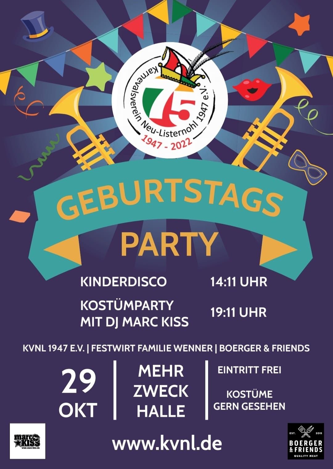(18.09.2022) Coronabedingt konnten wir unser Jubiläum "75 Jahre Karnevalsverein Neu-Listernohl" noch nicht richtig feiern. Was ursprünglich im Rahmen des Karnevalfestes im Februar geplant war, wird jetzt im Oktober nachgeholt. Wir feiern die Geburtstagsparty wie es sich für einen Karnevalsverein gehört als Kostümparty. Der Eintritt ist frei. Wir laden alle Freunde, Gönner und Karnevalisten des KVNL herzlich in die Mehrzweckhalle ein, um mit uns und DJ Marc Kiss auf unser großes Jubiläum anzustoßen.