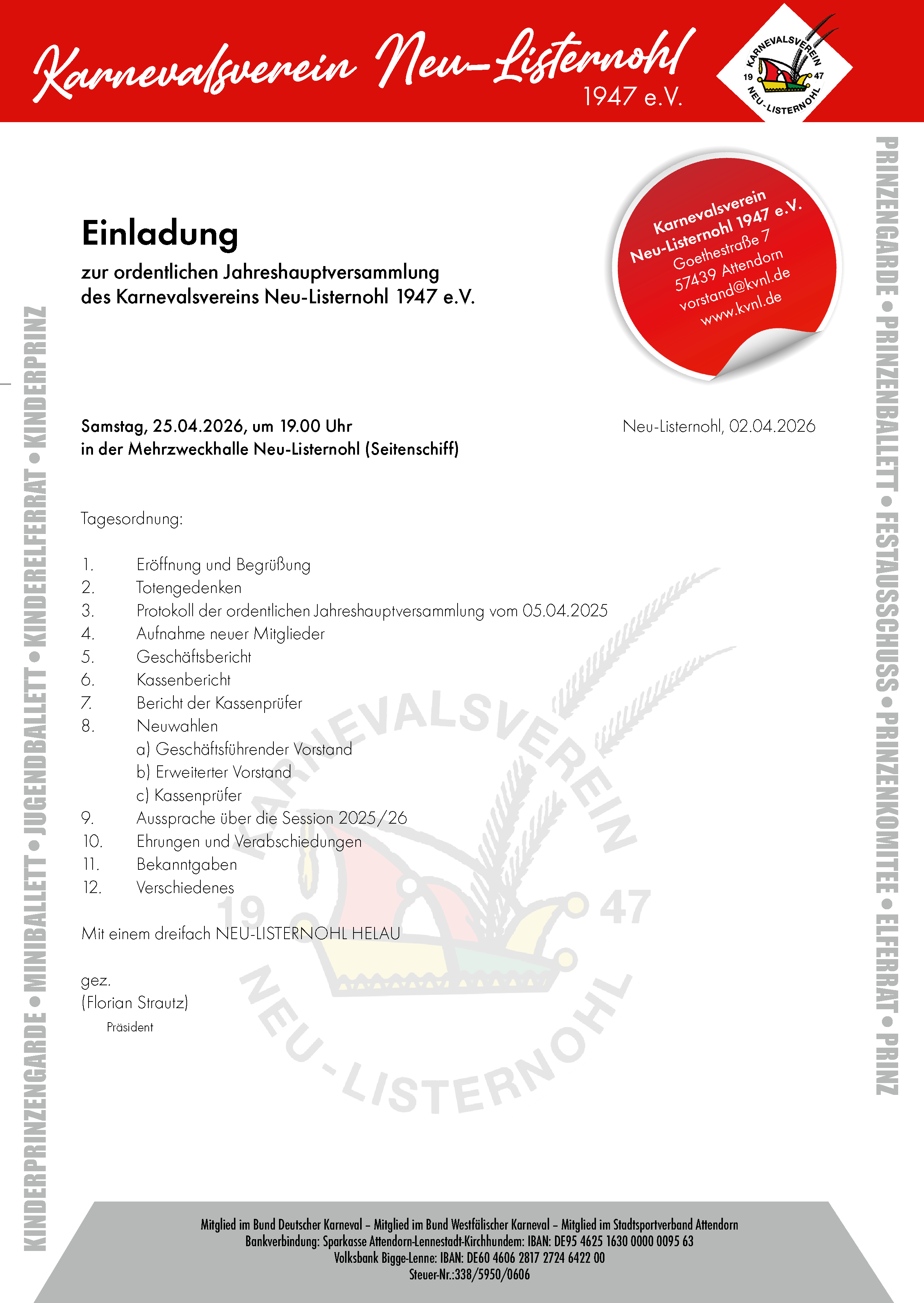 27.03.2026) Der Karnevalsverein Neu-Listernohl zieht Bilanz und lädt alle Mitglieder des Vereins herzlich zur diesjährigen Jahreshauptversammlung ein. Diese findet statt am Samstag, 25. April 2026, um 19.00 Uhr im Seitenschiff der Mehrzweckhalle. Neben den üblichen Regularien stehen auch Wahlen auf der Tagesordnung. Der Verein freut sich auf die Teilnahme vieler Mitglieder.